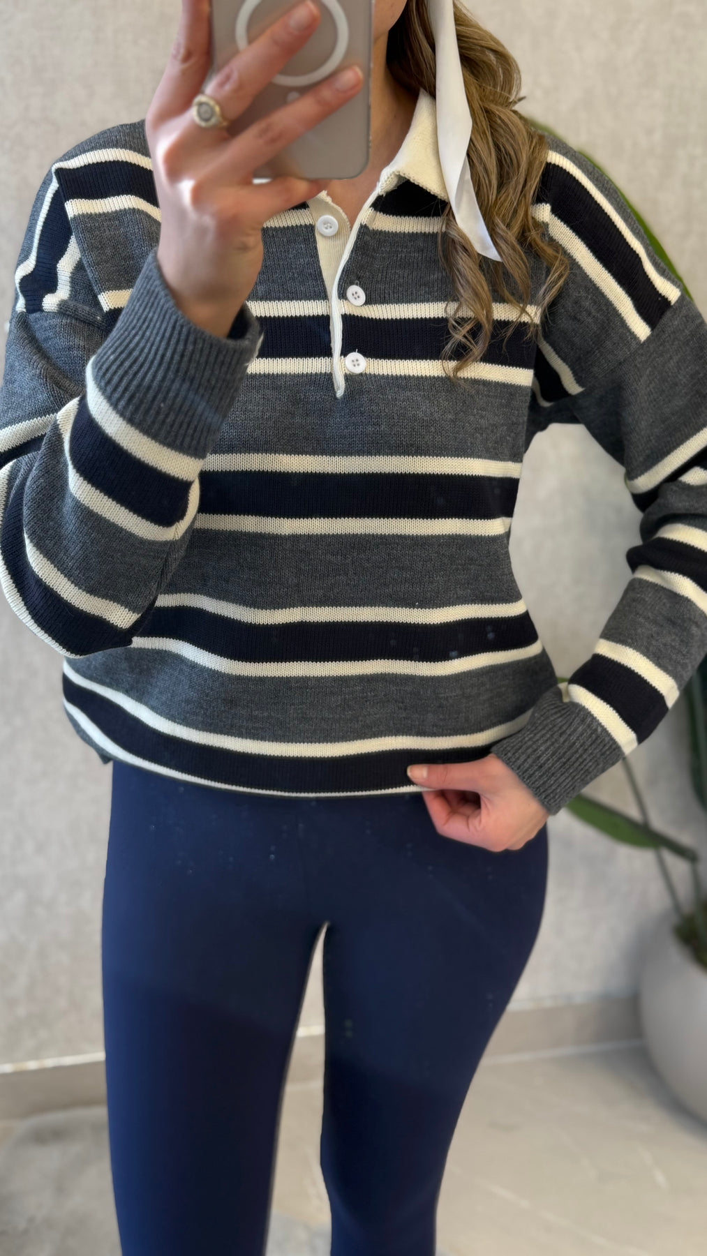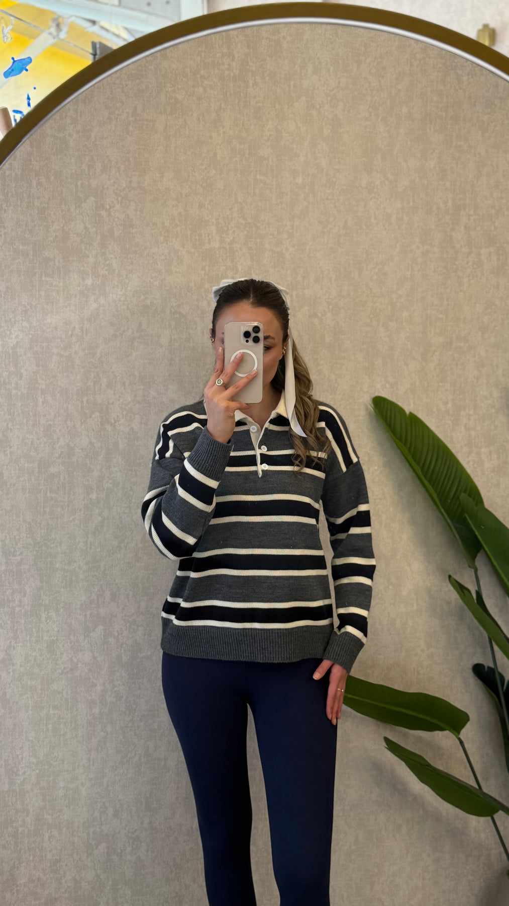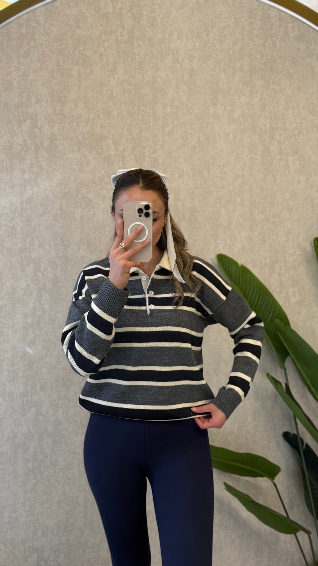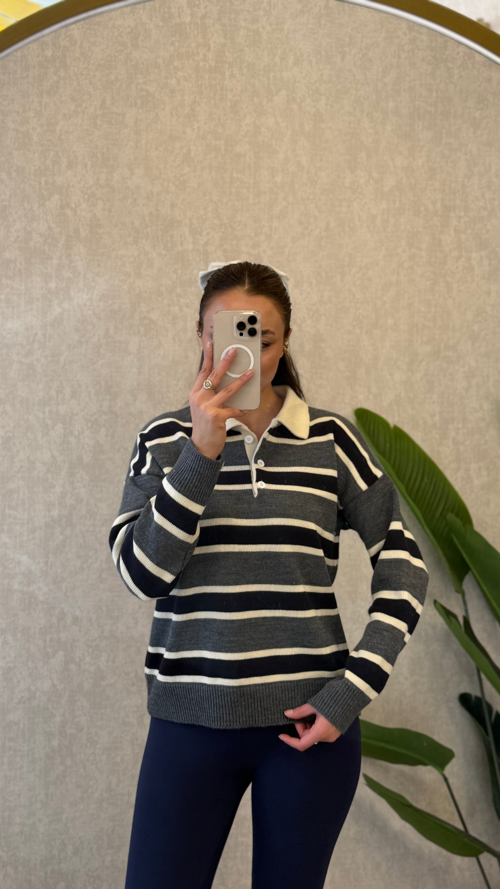 POLO YAKA ÇİZGİLİ GRİ TRİKO KAZAK
